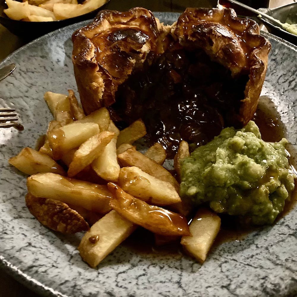 They only make so many and they are made to order so you have to wait patiently whilst you salivate over other peoples plates nearby. If I was going to give any advice on this I wouldn’t do what I did and just have a banana all day because you will start to eat your own insides. A glass of wine whilst you wait doesn’t help because you’re just adding to the acidic process. The wait, however, is worth it. The pie arrived like a tall column of magnificence, golden, shortcrust pastry loaded full of steak that fell apart in the thick meaty gravy when I sliced into it. Divine. I couldn’t breathe afterwards but I was more than happy to die at that point.